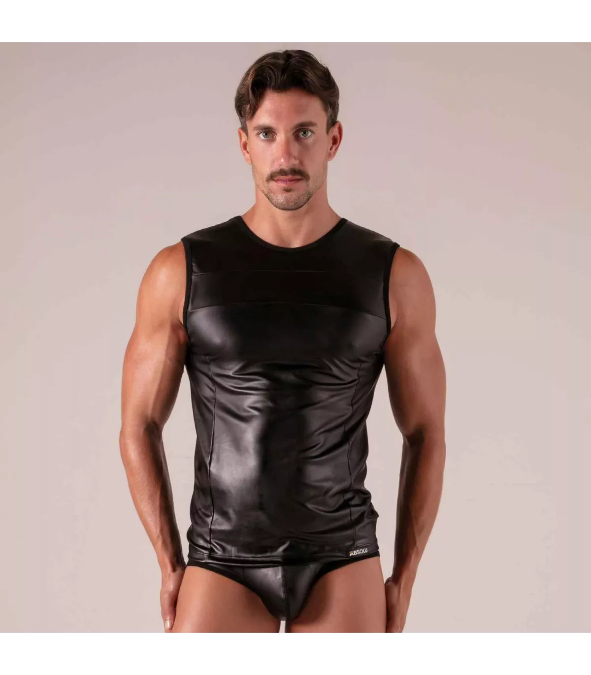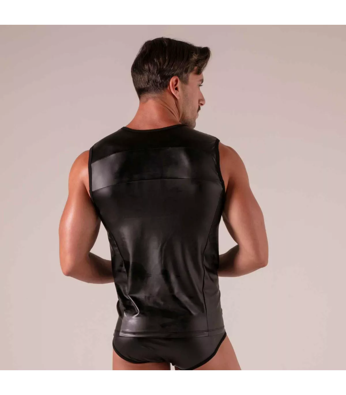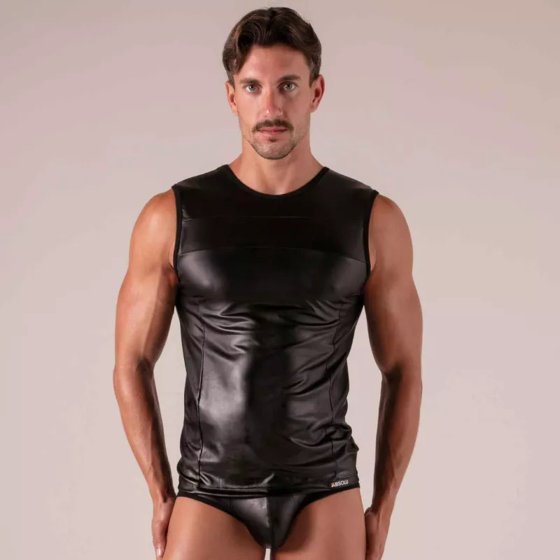 - Leather-look men’s tank top: a bold leather effect that catches every eye.